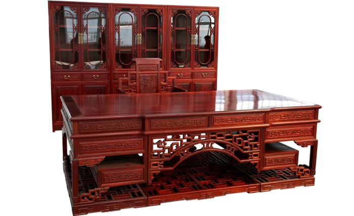 江蘇中尊木業(yè)有限公司書房系列產品:書房五件套草龍書柜、草龍大班枱、卷書寶座椅,洋花寫字枱等。